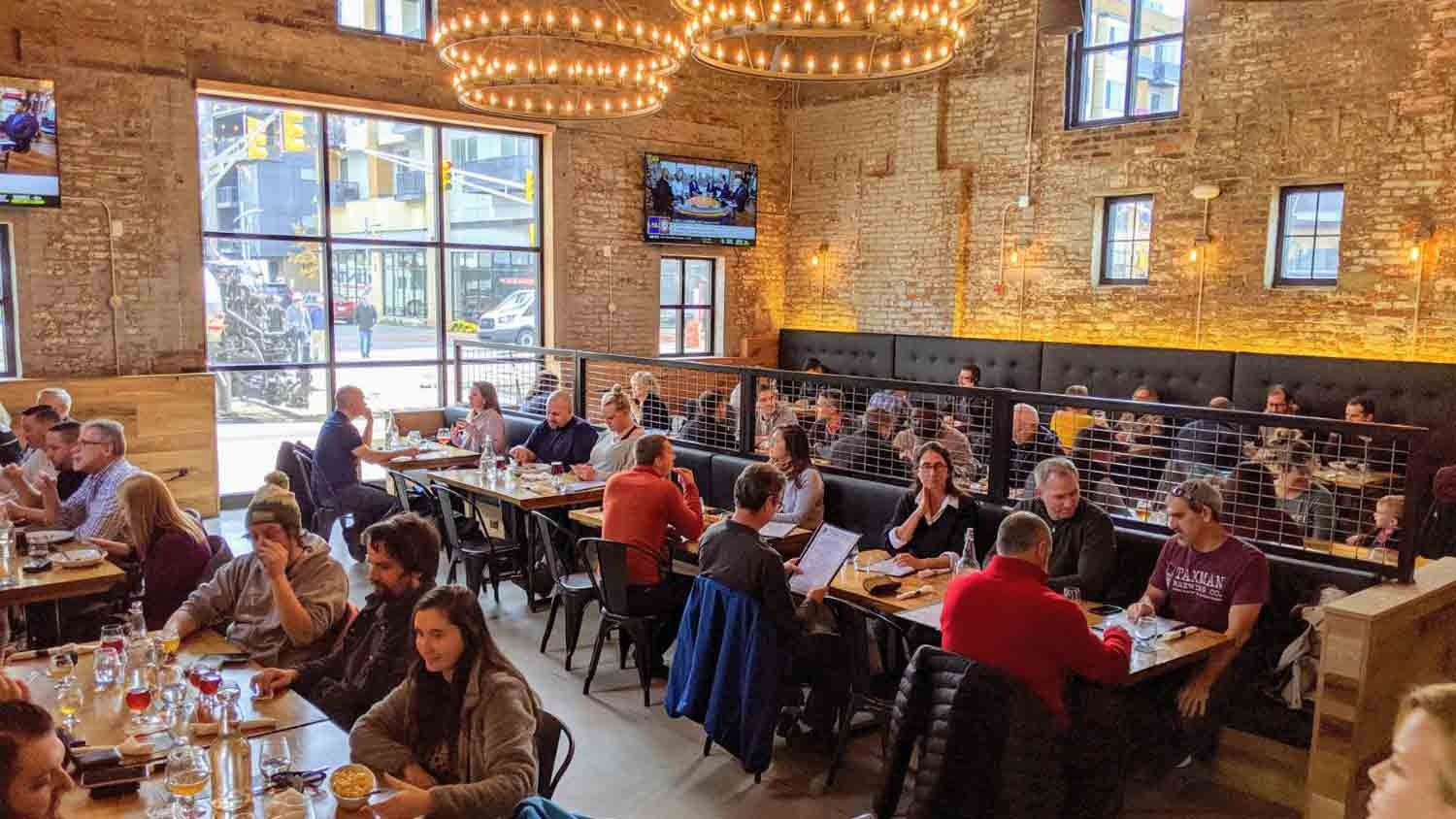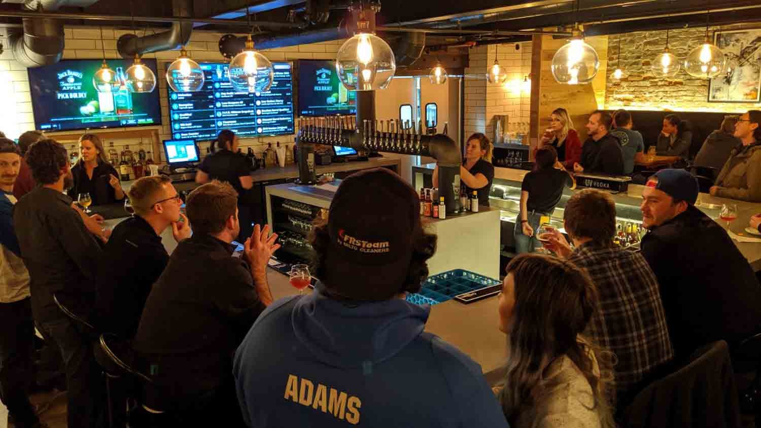 The gastropub features 20 craft beers on draft, a local and international wine selection and handcrafted cocktails. The draft beer selection showcases a wide variety of Belgian-inspired craft beers brewed by Taxman Brewing Company. Customers can purchase carry-out beer in 64oz growlers and 32oz bullets, as well as in cans and bottles.